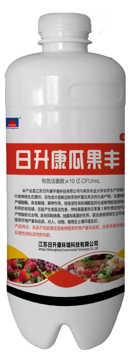 “日升康瓜果丰”是由江苏日升康环境科技有限公司生产的新一代微生态制剂产品,主要由枯草芽孢杆菌和地衣芽孢杆菌两大优良菌种组成。能够产生表面活性素、伊枯草菌素、泛革素3种活性强的脂肽类化合物等代谢产物,这3种化合物不仅具有抑杀细菌、病毒、真菌的功效,还能有效的分解病原菌的代谢产物,中和毒素,而且对人、动物、植物及土壤环境友好。